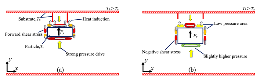 的最关键因素,热蠕流显著强化局部动量传递。研究团队基于上述机理提出了“热镊子”概念,即通过调控温度差和突起结构参数实现非接触颗粒捕捉与方向控制,该研究为稀薄气体中颗粒操控器件的优化设计提供了定量数值支持与理论依据。